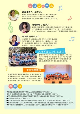出演:バイオリン・西澤亜佐、ピアノ・川崎槙耶、リトミック・川口夢、スマイルエンジェルズ、主任児童委員