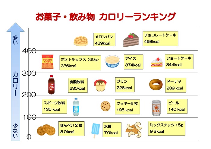 200kcalを超えるものは、分けて食べたり、回数が多くならないように気を付けましょう。