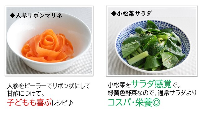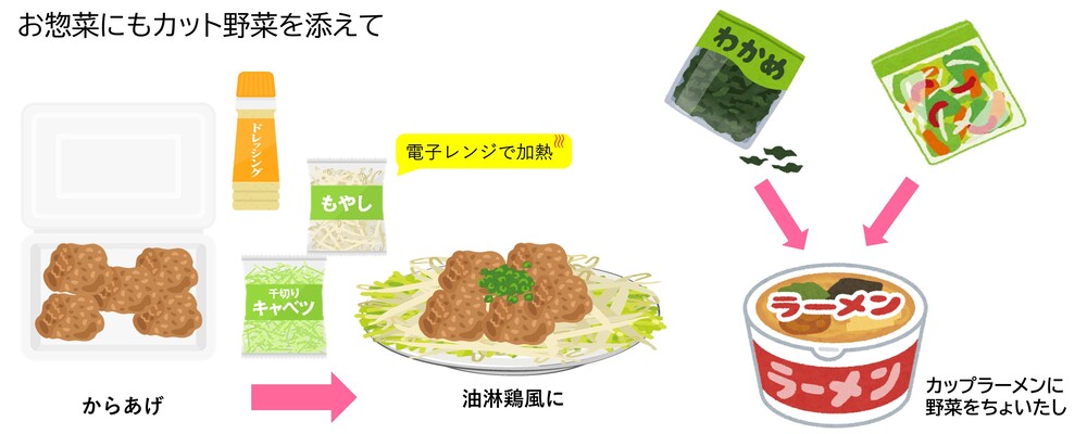 大人も子どももたっぷり食べられるよう野菜料理は多めに作ったり、かんたんに食べられる野菜を冷蔵庫にストックするのがおすすめです。冷凍野菜や乾物も保存ができるのでいざという時の備えにも。