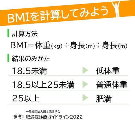 体重は重すぎても軽すぎても病気になるリスクが高くなります。自身の適正体重はBMIを用いて評価することができます。(18歳未満は発育曲線を参照)