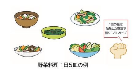 野菜は1日350g食べるのが目標で、野菜料理だと1日5皿が目安です。