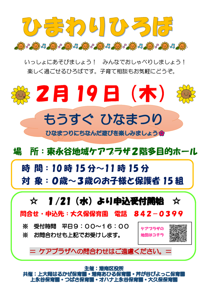大久保保育園 電話:045-842-0399(育児支援専用電話) 9:00~16:00