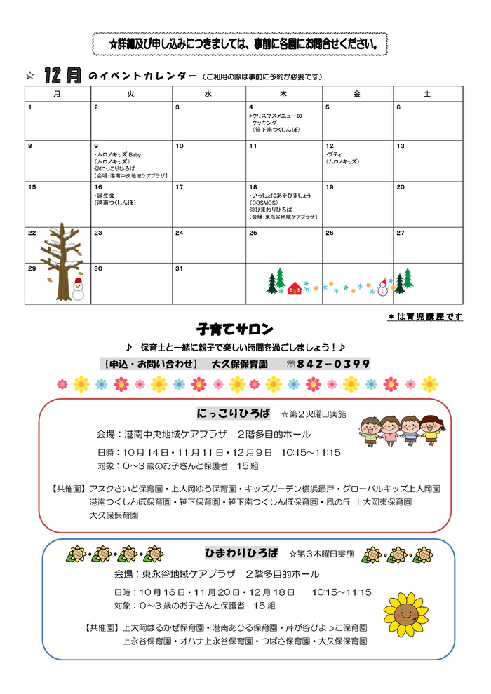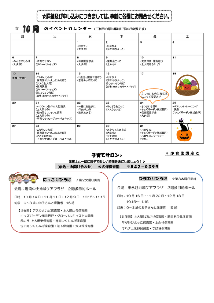 グローバルキッズ上大岡園保育園 | 367-8277 | ー | 10/7・14・21・28 12/9 支援事業開催時 | - |