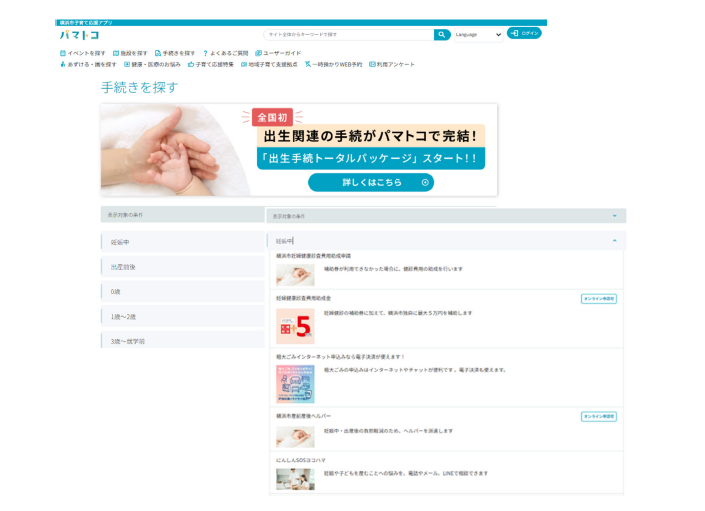 子の年齢や子育ての段階ごとに行政サービスや手続きが検索できます。