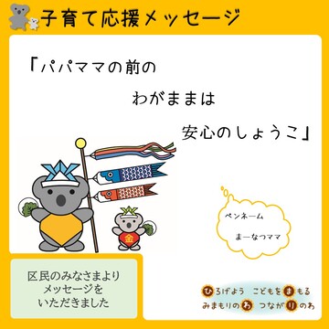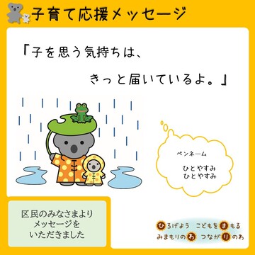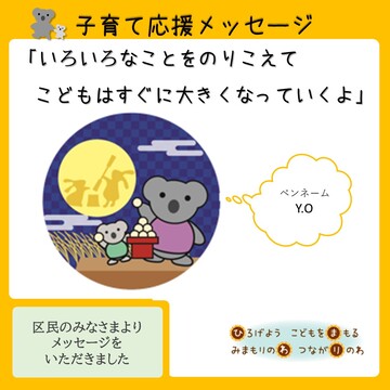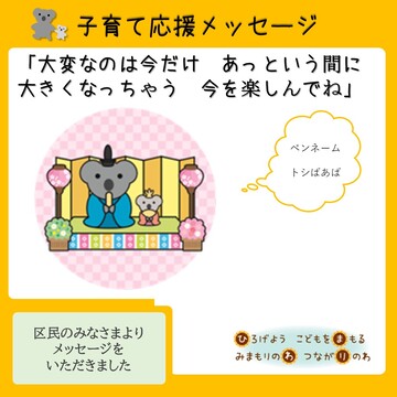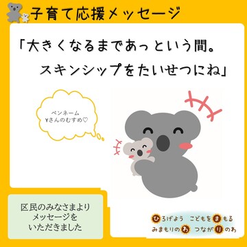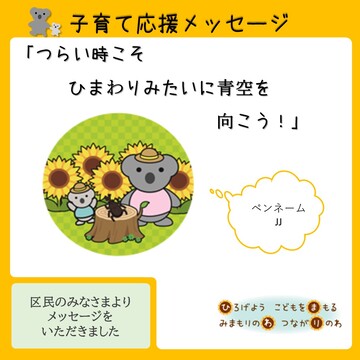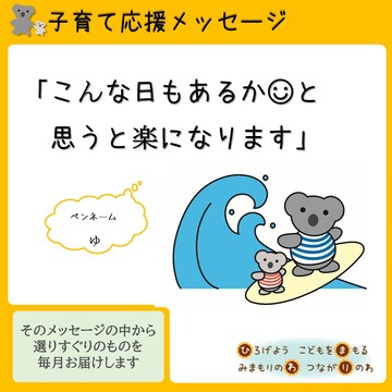 港南区では、妊娠中・子育て中の皆さんへのエールとなるよう、区民の皆さんから「子育て応援メッセージ」を募集しました。こちらのページでは、様々な世代の方々が、未来を担う子どもたちを育てている皆さんが元気になるような言葉の一部を紹介します。