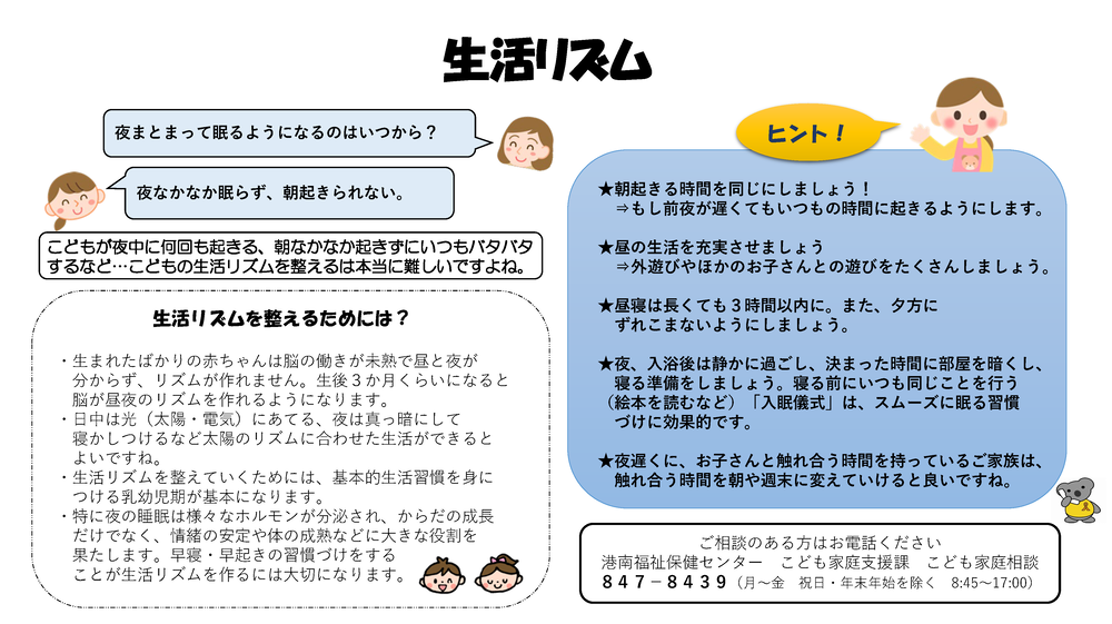 ・「早起き、早寝」で生活リズムを整えましょう。また、子どもの睡眠習慣は大人の生活スタイルを映す鏡です。家族全員の睡眠環境を整えることが大切です。