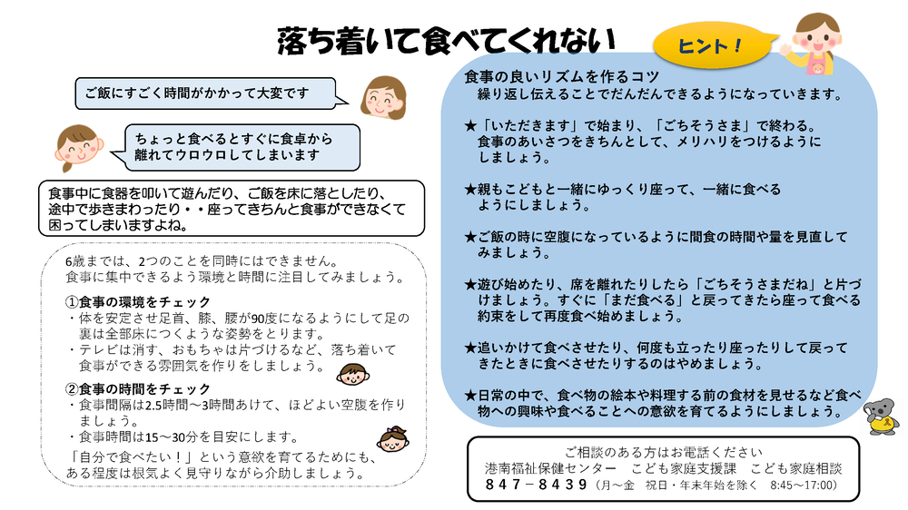 ・「いただきます」で始まり、「ごちそうさま」で終わる。食事のあいさつをきちんとして、メリハリをつけるようにしましょう。
