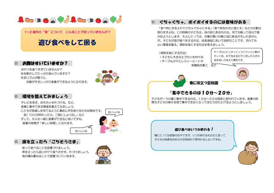 ・大人は子どもの正面に座るようにしましょう。大人の食べ方を見て真似ることができます。