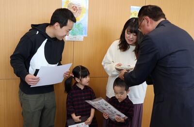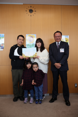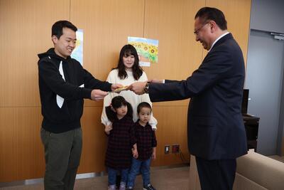 交付当日は、ご家族4人でお越しになり、栗原区長と記念撮影を行いました。栗原区長は申請いただいたことへの感謝をお伝えし、「銀婚式、金婚式など結婚の記念日や、それぞれの思いや記念を形にするためにお使いいただけたら」とメッセージをお送りしました。お二人、そしてご家族の末長い幸せをお祈りいたします。