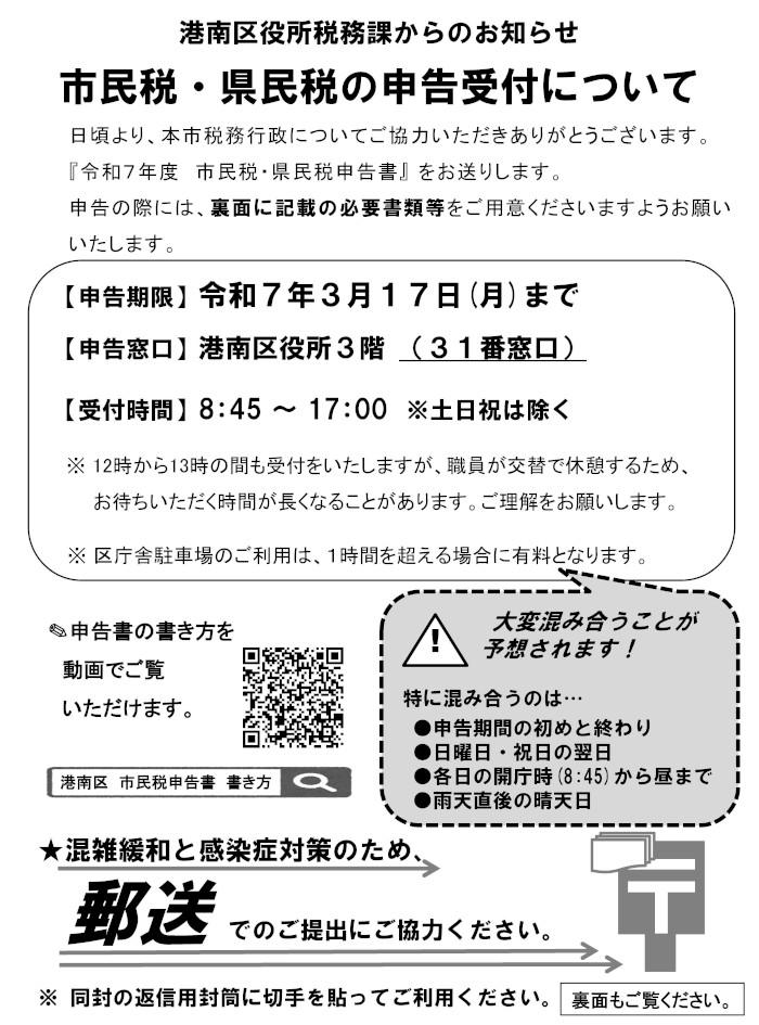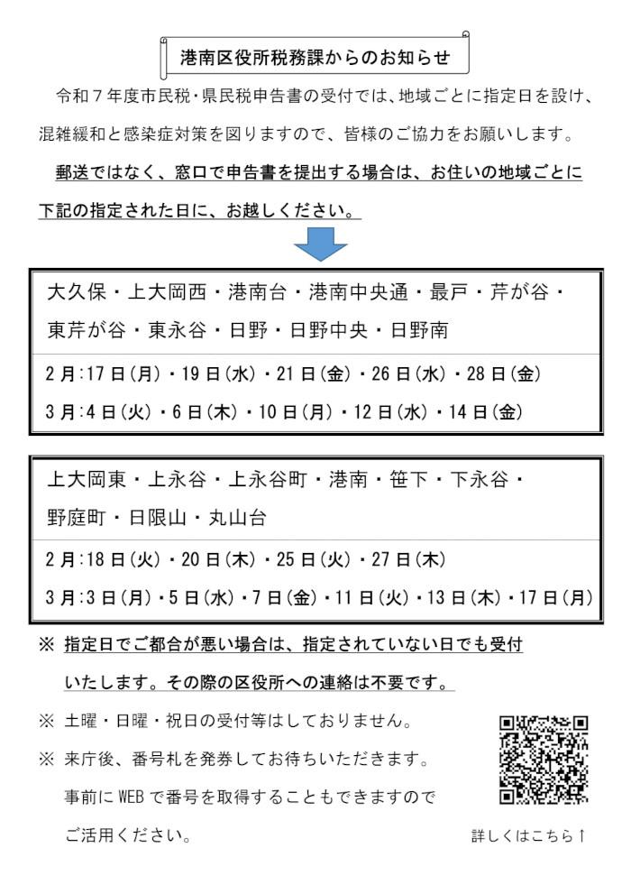 令和7年度市民税・県民税申告書の窓口受付は、混雑の緩和による感染防止を目的としお住いの地域ごとに指定日を設け、可能な限り指定日にご来庁をお願いしております。