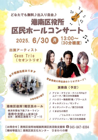 港南区役所1階区民ホールにて、音楽コンサートを開催します♪