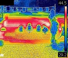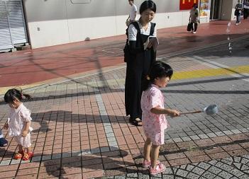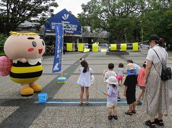 打ち水を始める前に路面温度を計測したら45℃もありました。多くの方にご参加いただき、遊びながら打ち水をしていただきました。
