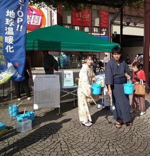 区民のみなさんが、地球温暖化対策に取り組むための啓発活動と区内商店街と連携した打ち水イベントを開催しました。