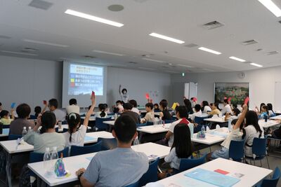 飛距離がギネス記録にもなっている「空気砲」や、ジャグリング、バルーンアート、マジックなどもご披露いただき、講演の最初から最後まで、子どもたちの笑い声・歓声があふれていました。先生のお手伝いをしてくれる子どもを募ったときには、会場全体から元気いっぱいに子どもたちの手が挙がり、私もたくさんの元気をもらいました。