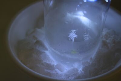 息を吹き込みフタを閉めたら、ドライアイスをセットして雪の結晶ができるのを待ちます。