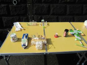 牛乳パック、ペットボトルなどで制作された思い思いの船