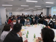 当日は、未就学児から90歳代の方まで総勢80名近い方々にお集まりいただきました。冒頭に「港南ひまわりプラン」や「私たちの暮らす地域の現状」について知るという学びの時間があった後、グループに分かれて「港南区の良いところ、改善が必要なところは?」など3つのテーマに沿ってお喋りを開始!この日が「はじめまして」の方も多かったのですが、とても楽しそうにお話され、時には年代の枠を超えて真剣に語り合う姿が印象的でした。