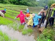 今年は4名の小学生と少なめですが、小雨の中で田植え作業を行うことができました。