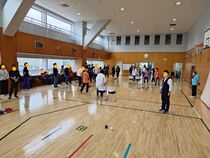ぽかぽか陽気の青空の下、450人を超える小学生の子ども達が10種類のスポーツ体験やゲームに挑戦しました。なんとかスコアを上げたいと、みんな頑張っていました。