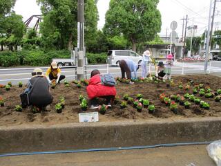 令和7年5月24日(土曜日)に、丸山台自治会や丸山台いちょう坂商店街の皆さんが、上永谷駅前花壇に約500粒のひまわりの種をまき、約1000株のお花を植えました。