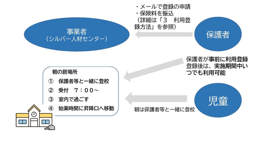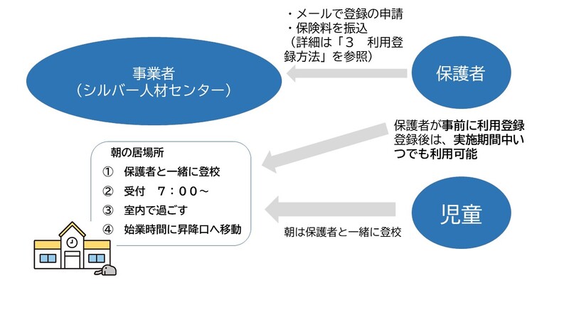 利用を希望する保護者は、事前に事業者(シルバー人材センター)へ保険料を振り込み、メールにより登録を行います。