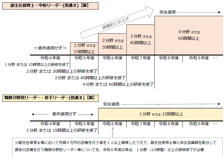 - 研修受講の重要性と円滑な要件の適用を考慮して、研修要件を段階的に適用することとし、副主任保育士・中核リーダー等については令和5年度、職務分野別リーダー・若手リーダーについては令和6年度を適用開始年度とする。