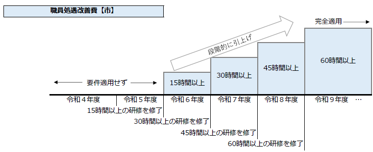 - 令和6年度に求める研修修了数は15時間以上とし、令和7年度以降、毎年度15時間ずつ必要となる研修修了数を引き上げる。
