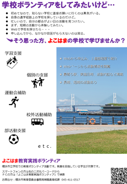 よこはま教育実践ボランティアは、教師を目指す大学生等が、横浜市立学校での学校体験を通して、教師の仕事を学ぶための活動です。Webページから活動したい学校を選び、申請することができます。詳細は左のポスターをクリック