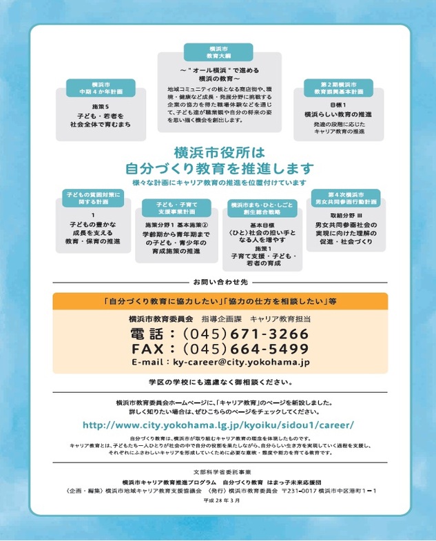 横浜市教育委員会では、文部科学省の委託を受け「横浜市地域キャリア教育支援協議会」を設置しています。横浜の大人たちが「はまっこの自分づくりを応援する」ことについて、熱く、本気で協議を重ねています。