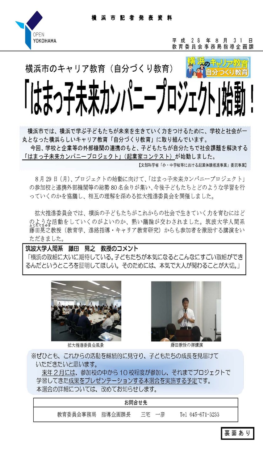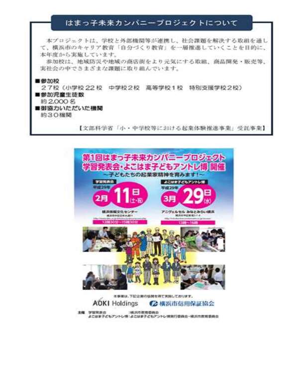 学校と企業等の外部機関が連携し、企業等の課題を児童生徒が主体的に考え、解決する取り組みを通して、横浜らしいキャリア教育「自分づくり教育」をより推進していくことを目的として28年度に横浜市で初めて実施した「はまっ子未来カンパニープロジェクト」を29年度も実施します。