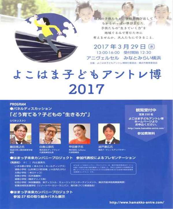 横浜の子どもたちの自分づくり教育を地域ぐるみで支えるために、大人たちにできることを考え合う場、「よこはま子どもアントレ博 2017」を実施します。多くの方々の御参加をお待ちしています。