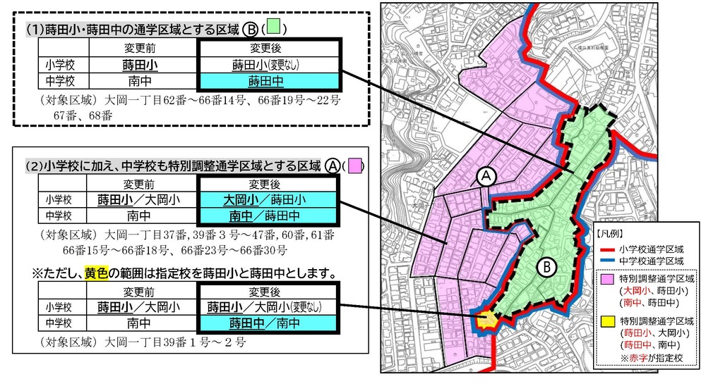 ②A区域については、これまでと同様に小学校を2校(蒔田小学校と大岡小学校)から選択できるとともに、中学校についても2校(南中学校と蒔田中学校)から選択できるように特別調整通学区域を設定します。