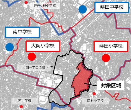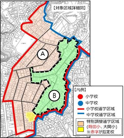 令和6年10月1日現在、大岡一丁目の一部では小学校を選択(指定校:蒔田小学校、受入校:大岡小学校)できる特別調整通学区域(※1)【(図2)A区域】がありますが、選択した小学校によって、指定校(南中学校)ではない蒔田中学校へ入学を希望されるというケースが常態化しています。また、同区域の東側【(図2)B区域】においても、同様の状況となっています。