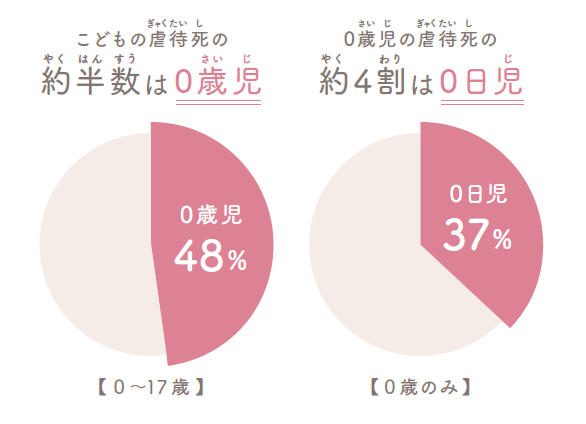 国の報告では、虐待による死亡事例(心中以外)のうち、0歳児の割合が約48%と最も高く、そのうちの約37%が生後0日で亡くなっています。