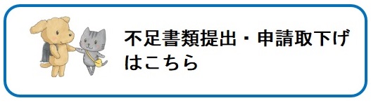 申請の際に不足書類があった場合、オンラインで追加提出することができます。以下の不足書類提出・申請取下げフォームで必要事項を入力後、不足書類の画像データ等を添付して提出してください。