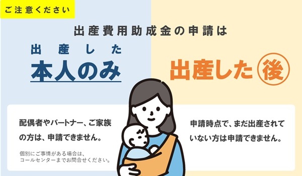 ※申請できるのは出産した方本人のみです。配偶者やご家族の方は原則申請いただけません。出産した方が未成年であることなどを理由に、本人からの申請が困難な場合は、コールセンターに事前にご連絡ください。