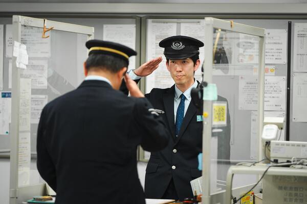助役と2人で行う乗務点呼のワンシーン。敬礼から始まって敬礼で終わる、緊張感ある場面だ
