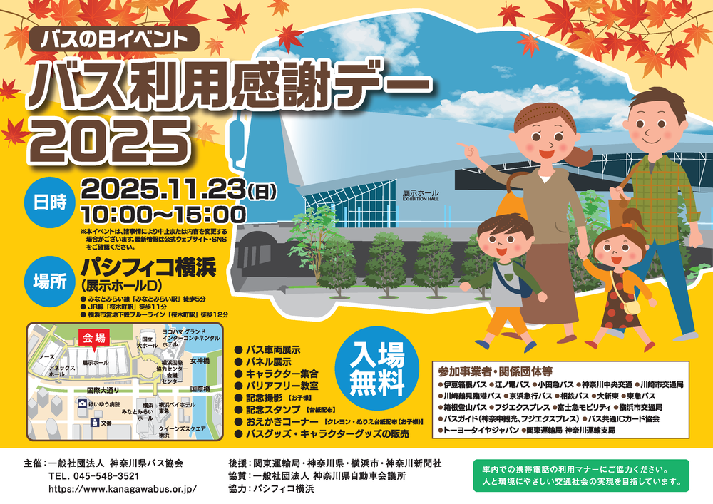 以下の日程にて、神奈川県バス協会主催のバスの日イベント「バス利用感謝デー2025」が開催されます。