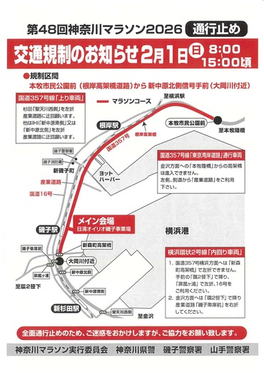 令和8年2月1日(日)に「第48回神奈川マラソン」が国道357号線(磯子駅付近~本牧市民公園前)において開催されます。
