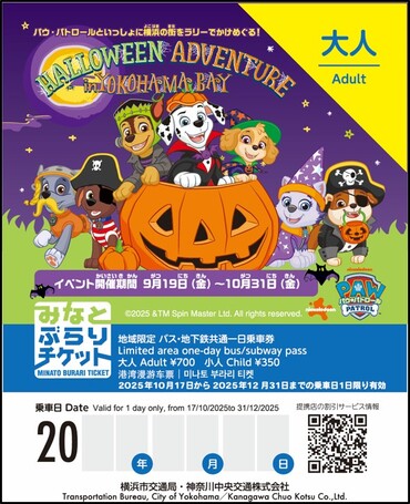 横浜市内で開催中の「パウ・パトロール ハロウィンアドベンチャー in よこはまベイ」と連携し、横浜市交通局はパウ・パトロール製作委員会と共に観光スポット周遊バス「あかいくつ」にパウ・パトロールの装飾を施したスペシャルバスを運行します。あわせて、特別デザインの横浜観光一日乗車券「みなとぶらりチケット」を数量限定で販売します。