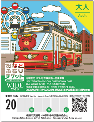 横浜観光一日乗車券「みなとぶらりチケットワイド」は、横浜ベイエリアを中心に、ベイサイドブルー、あかいくつを含むエリア内の市営バス・市営地下鉄および神奈中バスが乗り放題となり、割引・プレゼントなどの特典を受けられる乗車券です。
