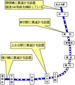 市営地下鉄(ブルーライン)全線(40.4km)の19%(7.7km)が地上区間で、次の地上部4箇所に風向風速計を設置しています。