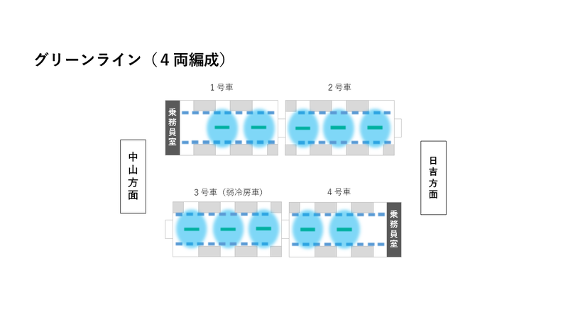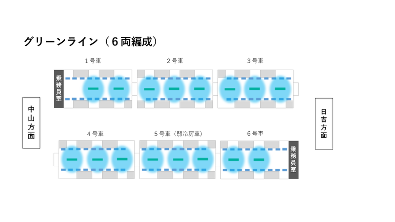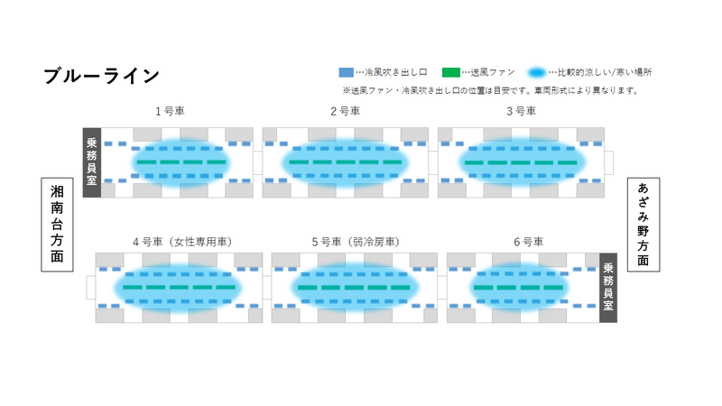 ブルーラインの5号車、グリーンラインの3号車(4両編成の場合)または5号車(6両編成の場合)を弱冷房車としています。弱冷房車は設定温度を普通車より約1~2℃高い設定としています。また、同じ車両の中でも車両と車両の連結部付近(車両の両端部)は送風機による風の影響を受けにくいため、比較的寒さを避けることができます。