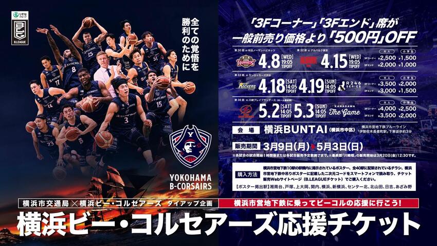 横浜市交通局では、地元プロスポーツチーム応援企画として「横浜ビー・コルセアーズ応援チケット」を特別価格で販売しています。