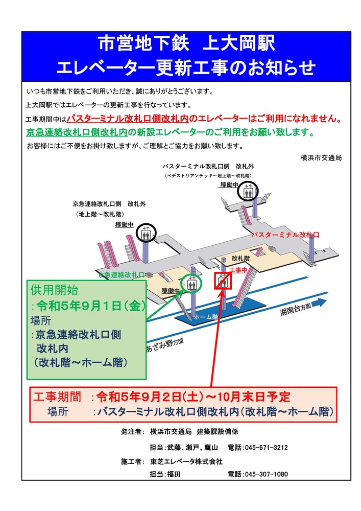 上大岡駅では令和5年9月1日(金曜日)から京急連絡改札口側の改札階とホーム間のエレベーターを供用開始します。