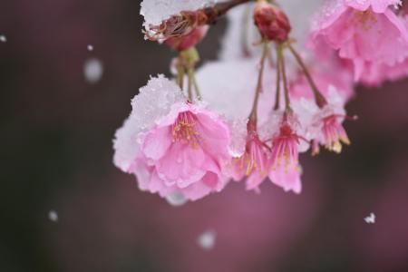 たまに、桜が咲いている時期に雪が降ることがあります。ソメイヨシノだと花と雪が同化してしまいますが、ヨコハマヒザクラだと赤い花に白い雪が映え、とても幻想的かつ写真映えする光景が生まれます。