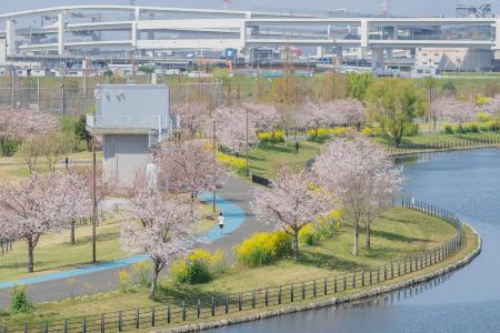 水路が低い位置に流れており、両岸の歩行者通路から桜を眺めることができます。また、その上に高低差約3mの上部通路があるので、水路を見下ろすようにも眺められます。