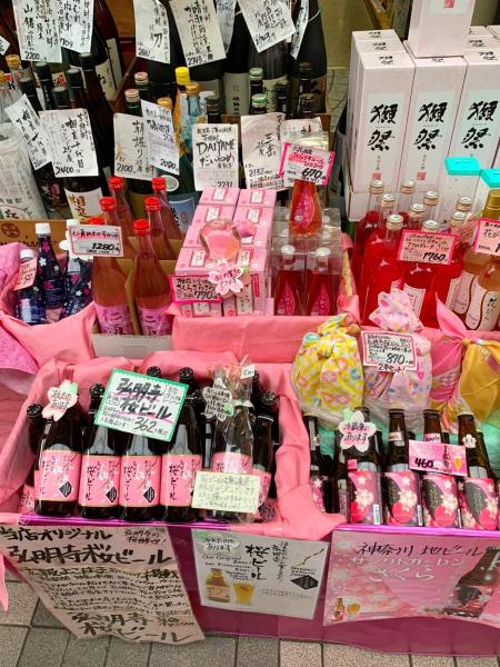 商店街の中にある酒屋さんも春一色。ビールを飲みながら夜桜鑑賞も良いかも。