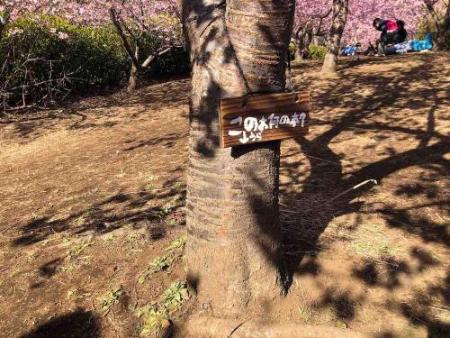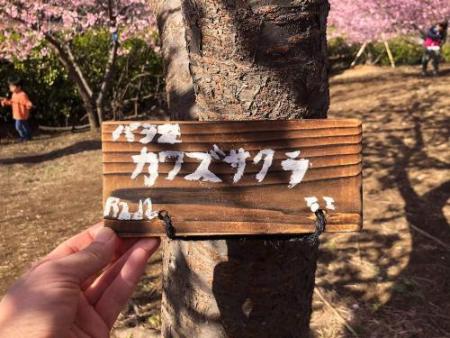 木にかけられた「この木何の木?」の板をひっくり返すと、「カワヅザクラ」の文字。