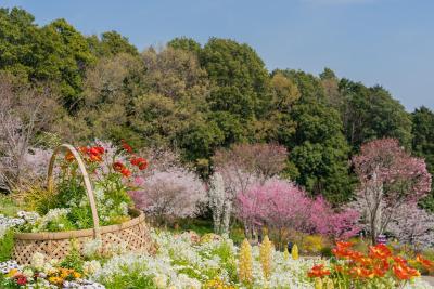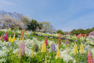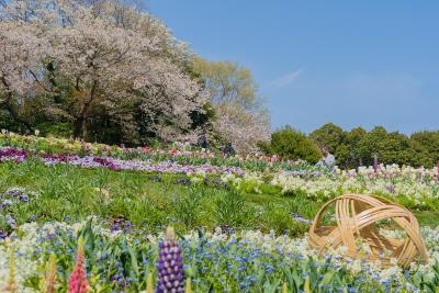 傾斜に沿って流れるような見事な枝ぶりの桜は3〜4分咲き、赤や黄色、白とカラフルなチューリップは2〜3分咲きといったところ。ここ最近の急な暖かさもあり、まもなく見ごろのピークを迎えそうです。